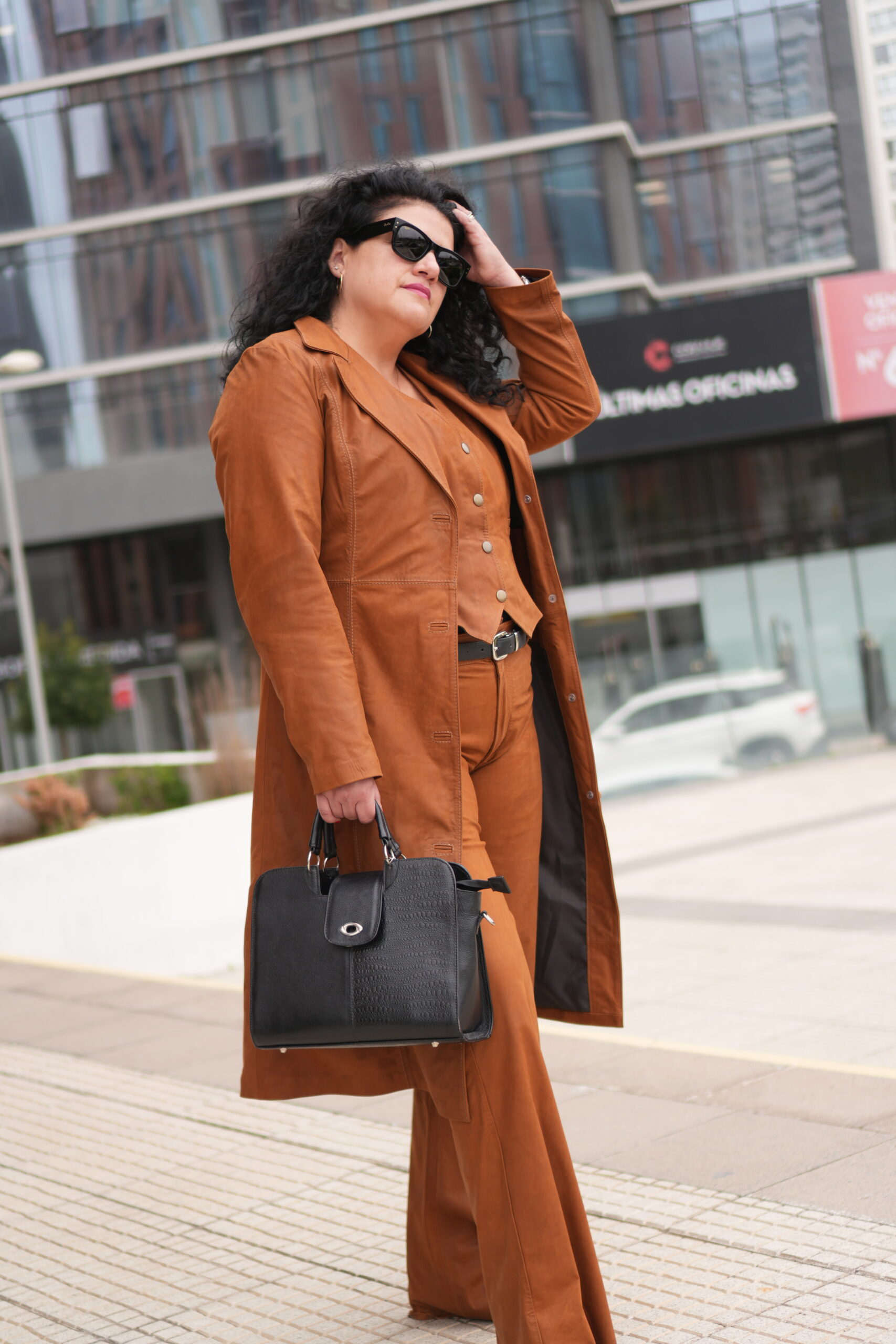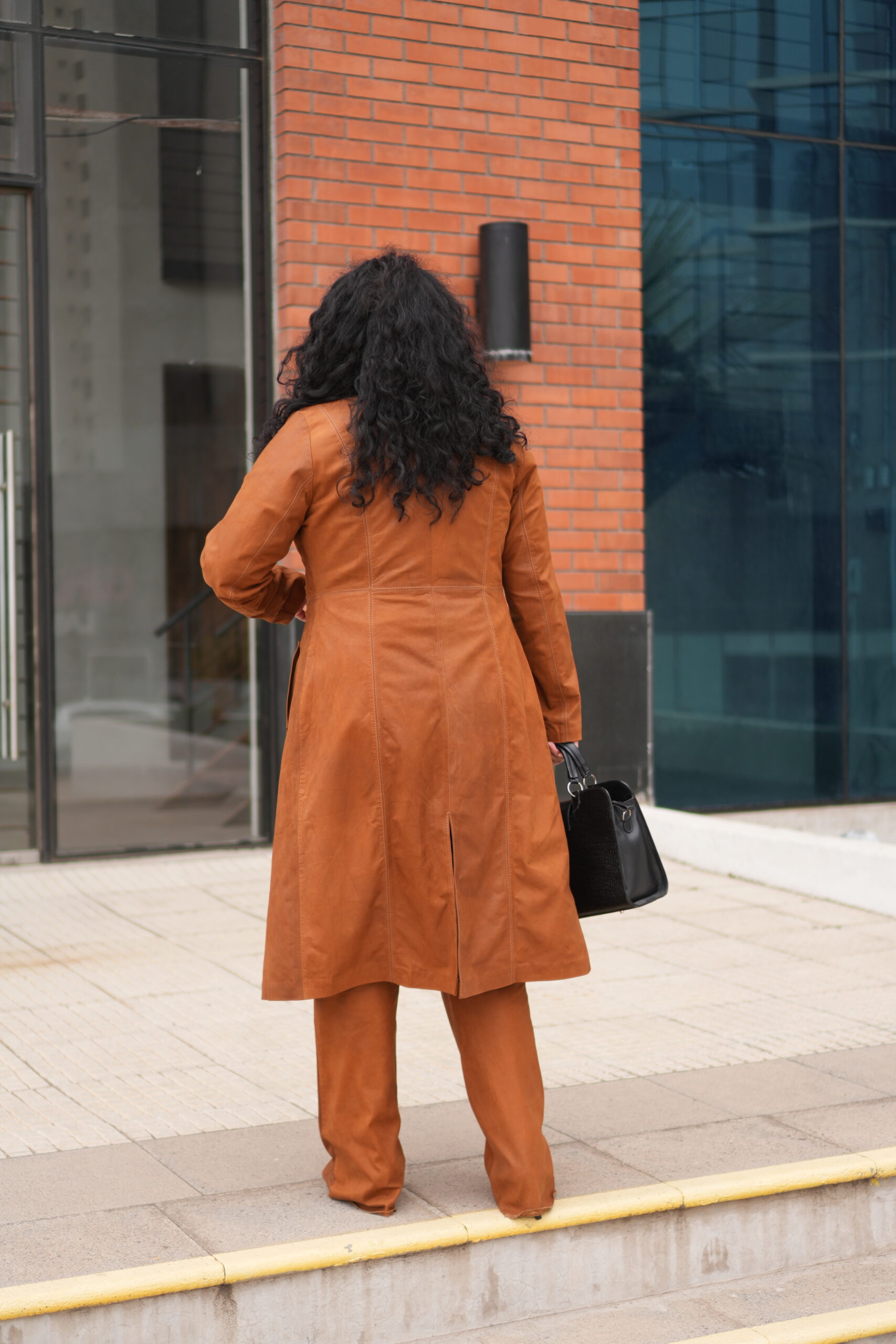 Confeccionado en cuero legítimo de alta calidad, su corte largo y cruzado, botones al frente y cinturón ajustable realzan tu figura con elegancia y actitud.